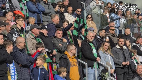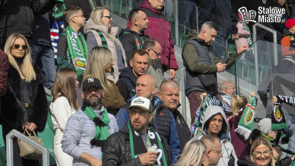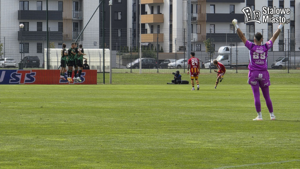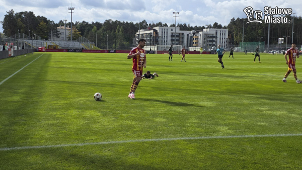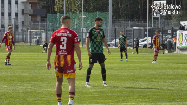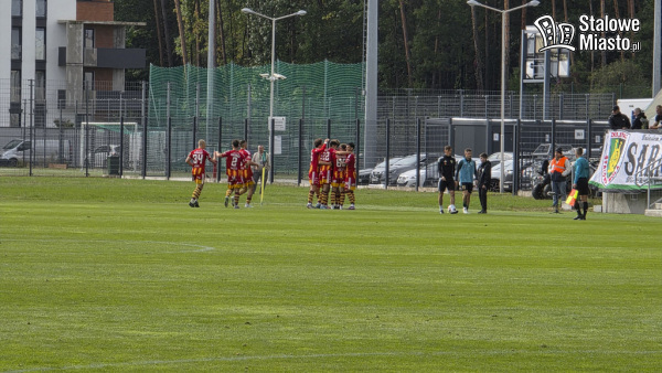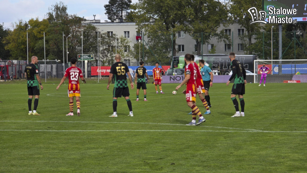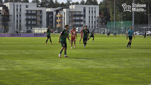 I połowa: rozpoczęła się niewykorzystanymi szansami Stalówki. Zielono- czarni wciąż atakowali pod bramką MKS, ale to w 19. minucie, po faulu na zawodniku gości i rzucie wolnym, Jakub Żywicki z Chojniczanki otworzył wynik meczu. Przegrywaliśmy 0:1. I takich sytuacji, kiedy mogliśmy stracić dużo więcej, było za chwilę kilka. Zauważyć można było brak koordynacji ze strony piłkarzy z hutniczego grodu, masę nieskutecznych podań i przejętych piłek przez Chojniczankę. W 32. minucie żółtą kartkę dostał Kukułowicz. W 36. minucie, po pięknej asyście Radecki- Hrnciar Dawid Łącki zdobył gola dla Stalówki. Zaczynaliśmy więc spotkanie od początku z nadzieją na więcej. Radość nie trwała zbyt długo, bo już 3 minuty później omal nie straciliśmy bramki. Chojniczanka znów atakowała.