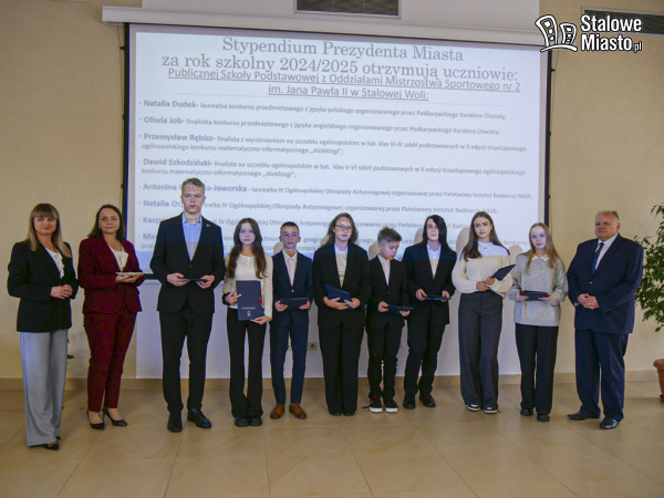 [p]W kolejnej części uroczystości wręczono stypendia Prezydenta Miasta Stalowej Woli dla uczniów szkół podstawowych i Samorządowego Liceum Ogólnokształcącego im. Cypriana Kamila Norwida, którzy w roku szkolnym 2024/2025 osiągnęli wybitne wyniki w nauce oraz odnieśli sukcesy w konkursach i olimpiadach przedmiotowych.– To młodzi ludzie, którzy już dziś pokazują, że nauka, pasja i konsekwencja prowadzą do wielkich rzeczy. Ich sukcesy to duma nie tylko rodziców i szkół, ale całego miasta. Dziękujemy, że w tak piękny sposób promujecie Stalową Wolę – zwróciła się do stypendystów Zastępca Prezydenta Miasta.