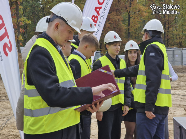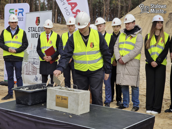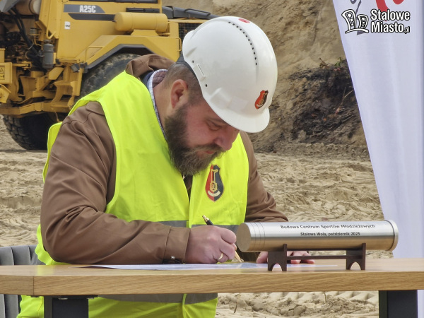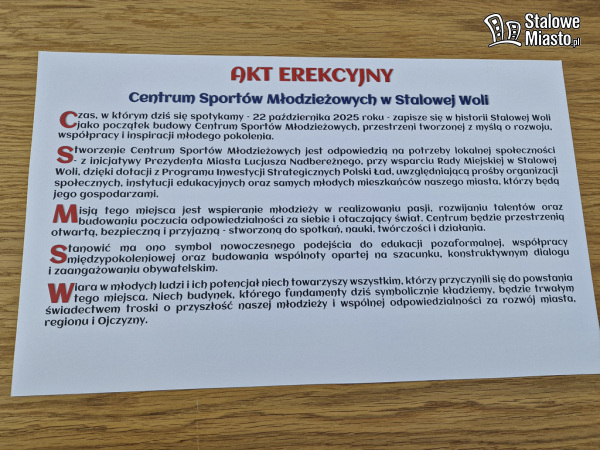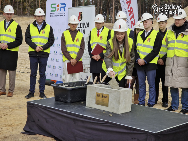 Wmurowanie kamienia węgielnego miało miejsce 22 października 2025 roku na ul. Energetyków. A że to centrum młodzieżowe, sprawy dziś w swoje ręce wzięli młodzi ludzie, którzy na co dzień uczą się w stalowowolskich szkołach i angażują w prace w Młodzieżowej Radzie Miasta: Lena Dębowska i Miłosz Nadbereżny. I to oni poprowadzili uroczystość, w której udział wzięli: prezydent Stalowej Woli Lucjusz Nadbereżny, senator Janina Sagatowska, poseł Rafał Weber, poseł Krzysztof Sobolewski, starosta powiatowy Janusz Zarzeczny, ks. Wacław Gieniec, w imieniu marszałka wiceprzewodnicząca Sejmiku Województwa Podkarpackiego Renata Knap, radna Sejmiku Kamila Piech, przewodnicząca RM Agata Krzek wraz z radnymi RM, skarbnik Miasta Michał Buwaj, przewodniczący Młodzieżowej Rady Miejskiej w Stalowej Woli Mikołaj Różański wraz radnymi MRM, zarząd spółki Sport i Rekreacja, naczelnicy wydziałów miejscy i inspektorzy, przedstawiciele firmy budowlanej, realizującej zadanie.