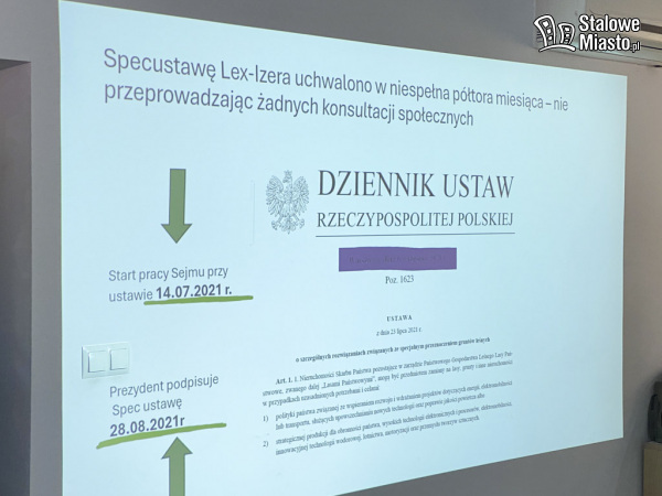 Spotkanie poprowadziła poseł Elżbieta Burkiewicz, która przedstawiła prezentację dotyczącą zamiany gruntów leśnych, na których powstaje obecnie Strategiczny Park Inwestycyjny. Wyraziła obawy co do konsekwencji dla środowiska naturalnego po wycięciu prawie 1000 hektarów lasu. Pytała o to, dlaczego wycięto 58,8 ha lasu pod budowę koreańskiej fabryki SK Nexilis, skoro zakład powstał na połowie tej działki. Poruszyła również sprawę budowy drogi wojewódzkiej, która ma obsługiwać Strategiczny Park Inwestycyjny, docelowo łącząc się z drogą S19. Zaznaczyła, że pod realizację tego przedsięwzięcia potrzebna będzie wycinka ponad 100 h lasów Puszczy Sandomierskiej.