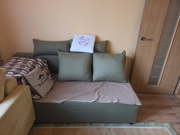 Kanapa rozkładana. Siedzisko wysuwa się do przodu, a oparcie kładzie. Dwie duże i dwie małe poduszki dekoracyjne. Pojemnik na pościel na całej długości łóżka. Kolor khaki. Możliwość obejrzenia wcześniej.