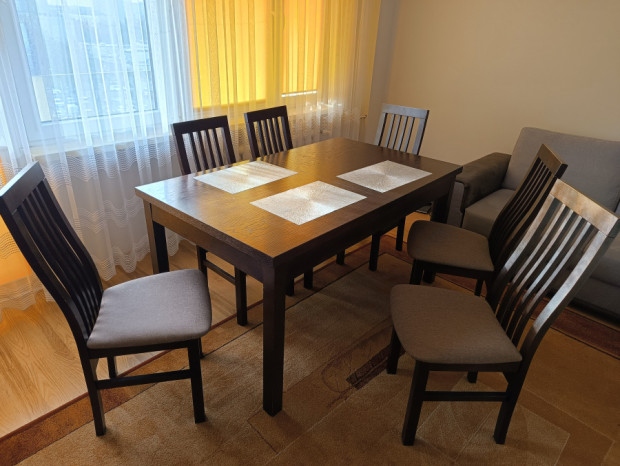 Sprzedam stół 150x90cm rozkładany (po rozłożeniu 200x90cm) wraz z 6 krzesłami. Naturalna okleina w kolorze mahoniu. Podana cena do negocjacji. Lokalizacja Stalowa Wola.