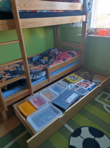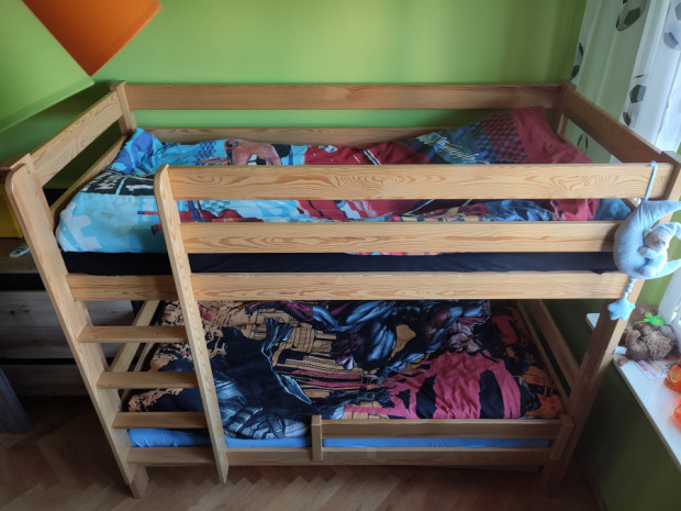 Sprzedam łóżko piętrowe w bardzo dobrym stanie. Łóżko ma dużą szufladkę, można je rozdzielić na dwa pojedyncze łóżka. Wymiary łóżka 187x90, wymiary materaca 180x80.