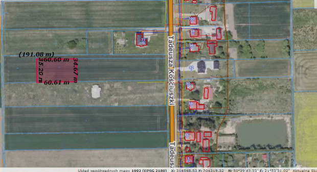 Działka o nr ewid. 165/5 zajmuje powierzchnie 21,33 ara położona jest przy ul. Kościuszki w Zaleszanach. Działka w kształcie prostokąta o wymiarach głębokości ok. 35 m i długości ok. 60 m.