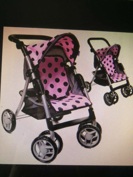 wozek z lalką, ktora przy użyciu smoczka śmieje sie , płacze i mowi mama