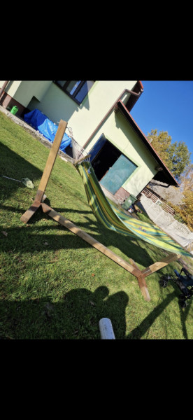 Sprzedam hamak z solidnym stojakiem . Metalowe części sa pomalowane na czarno.