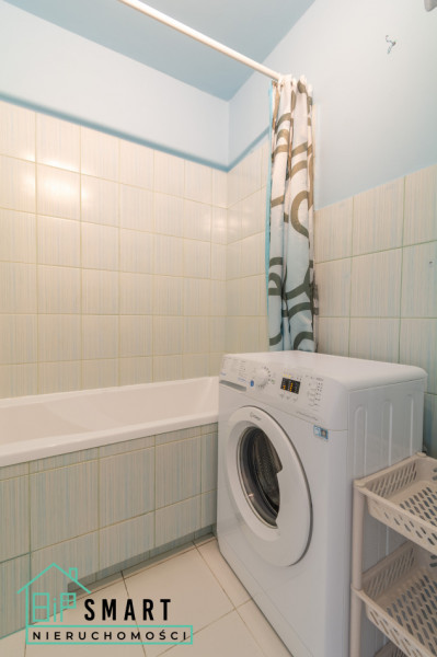 Łazienki z wanną, toaletą, szafką z umywalką oraz pralką,