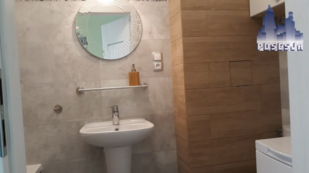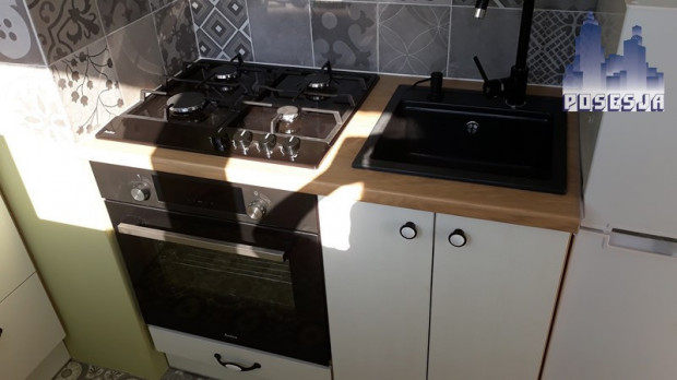 Kuchnię wyposażono w: meble na zamówienie z cichymi domykami, płytę gazową, piekarnik, zlew granitowy, lodówkę, mikrofalę. Łazienka z pralką. Baterie firmy Grohe.