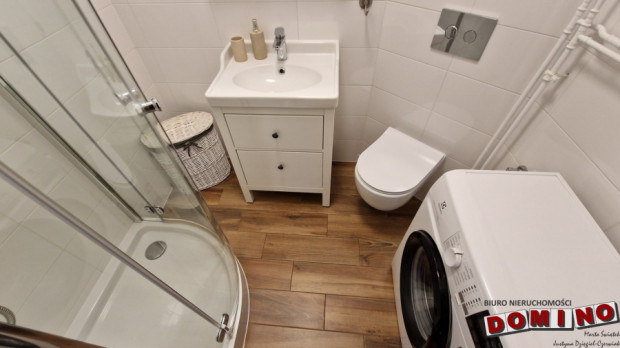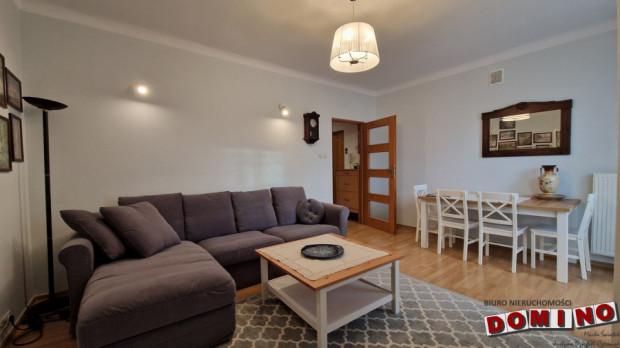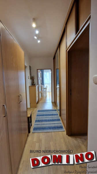 Na podaną powierzchnię składają się: sypialnia, duży przestronny salon z wyjściem na niewielki balkon, kuchnia samodzielna, w zabudowie meblowej wraz ze sprzętami AGD (lodówka, pralka, płyta indukcyjna, piekarnik, zmywarka), łazienka z wc (z wygodnym prysznicem). W przedpokoju wygospodarowano przestrzeń na dwie, duże zabudowane szafy.