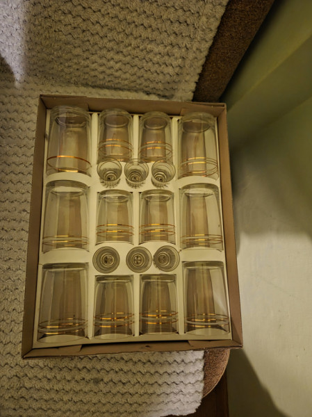 5. Komplet szklanek , literatek i kieliszków ze złotą dekoracyjną linia. 15 zł