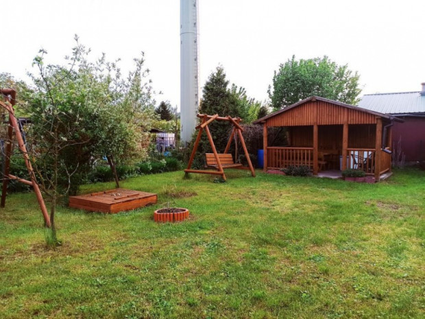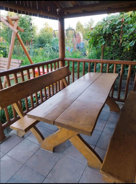 Piękna drewniana altana z dużym stołem z Bieszczad i huśtawka zachęcają do spędzania wolnego czasu.