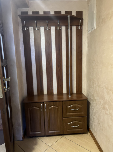 Sprzedam solidną, drewnianą szafkę przedpokojową z wieszakami i szufladami. Może służyć jako praktyczny mebel do przechowywania i organizacji przedpokoju. Prezentuje się estetycznie i pasuje do różnych stylów wnętrz.