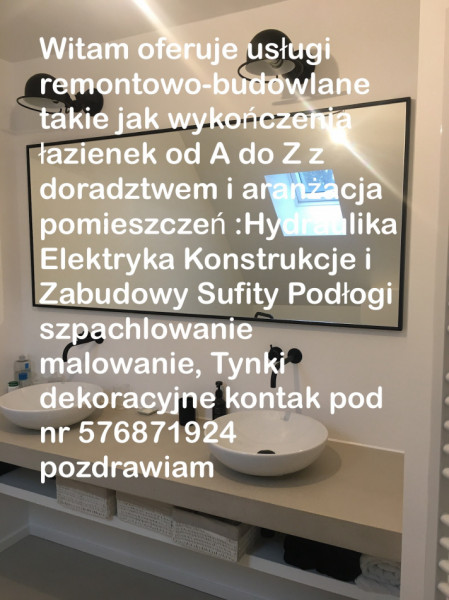 Witam wykonuje usługi remontowo budowlane łazienki od Ado Z podłogi,zabudowy ,sufity ,składanie mebli, elektrykę i hydraulikę ogólnie całe wykończenia pod klucz