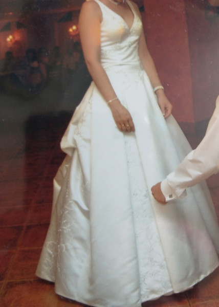 Suknia jest w rozmiarze S, na osobę o wzroście 168 cm+ 2-4 cm obcas. Skład materiału jedwab i satyna. Ozdobiona perełkami, srebrnymi cekinami i białym haftem. Z tyłu zamek. Talia ok. 66cm, biust ok. 82cm. Halka i welon gratis