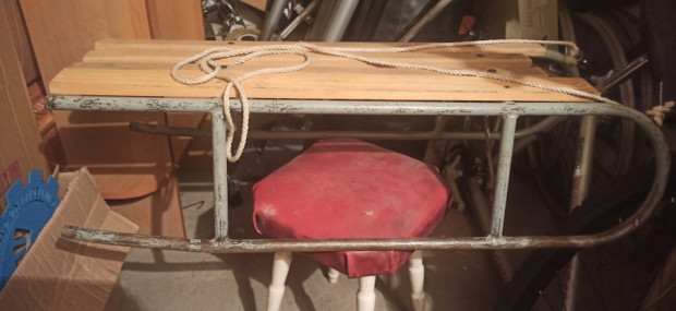 Solidne sanki metalowe - używane - dla dorosłych i dzieci. Wymiary: dł. 87 cm, szer. 25 cm, wys. 23 cm.