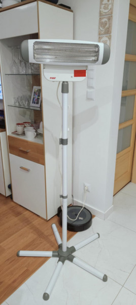 Dwa poziomy mocy 400 i 800W, timer gdybym nie miał wolnej ręki do wyłączenia, dobre zabezpieczenia, stojak i możliwości zamontowania na ścianie.