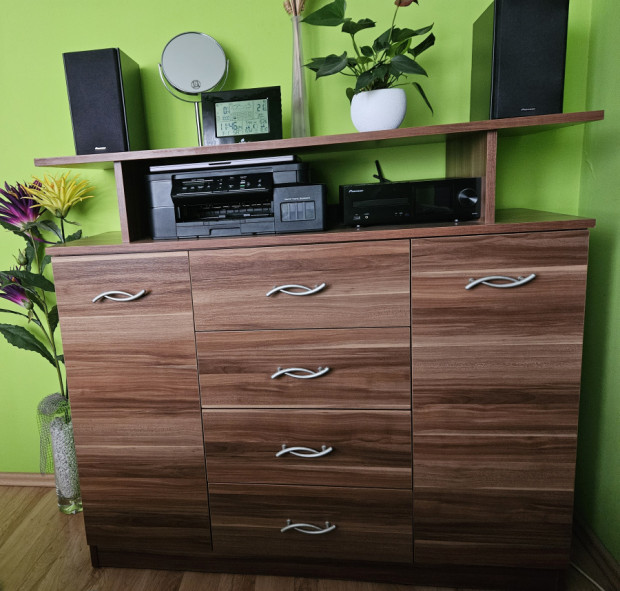 W komodzie jest miejsce na drukarkę ze skanerem , 4 szuflady i 2 otwierane szafki.