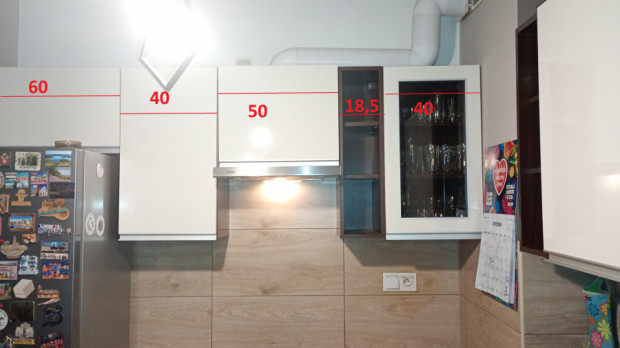 Górne szafki mają gł 31 cm z frontami, wys 36 nad lodówką , 43 cm nad okapem, pozostałe 71,5 cm