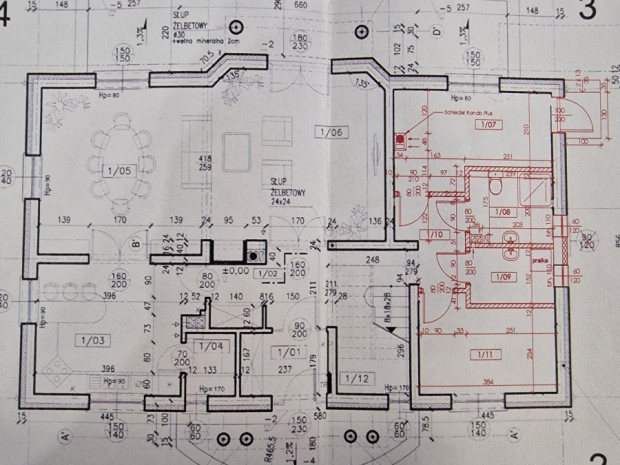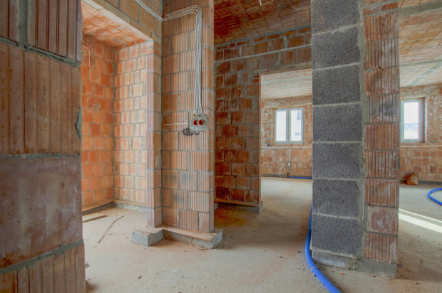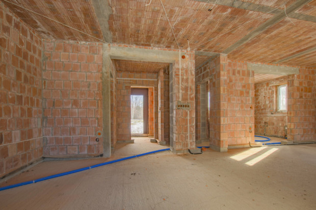 Budynek gospodarczy na etapie wylanych fundamentów, gdzie projekt obejmuje budynek parterowy niepodpiwniczony, z dachem wielospadowym, w którym zaprojektowane zostały trzy pomieszczenia gospodarcze i jedno pomieszczenie garażowe z miejscem na dwa samochody.