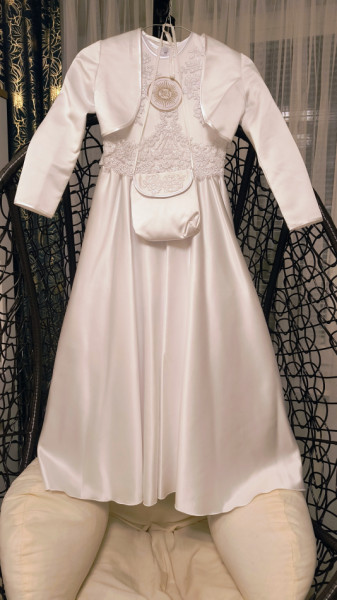 Sprzedam sukienkę komunijną. Wzór z kościoła Opatrzności Bożej. Długość całkowita 110cm obwód talia 60cm. Do sukienki wianek ,torebka, rękawiczki, bolerko, puchata narzutka na chłodny dzień i kolo.
