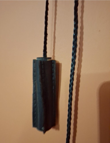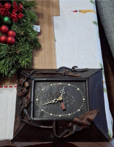 Zabytkowy zegar skórzany w stylu retro z PRL wyprodukowany przez Spółdzielnię Rzemieślniczą w Pabianicach. Zegar posiada metalową tarczę z motywem kółek i kropek, oprawiony w ciemną skórę. Na baterię L14.