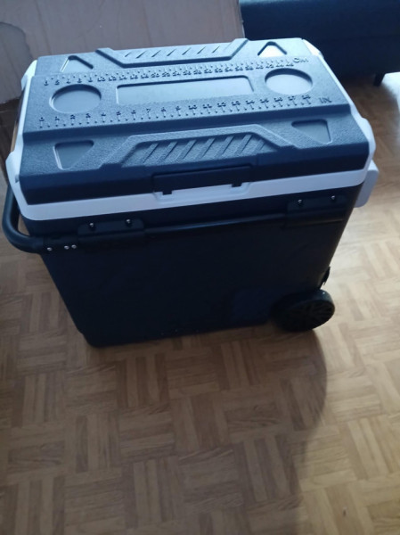 Lodówkę turystyczna dwie komory, 52 l temperatura chlodzenia -20stopni, możliwość regulacji temperatury dla każdej komory osobno zarówno recznie jaki i za pomocą aplikacji przez telefon. Lodówka była zakupiona z małym pęknięciem plastiku i została sklejona. Dodatkowym atutem lodówki sa kółka