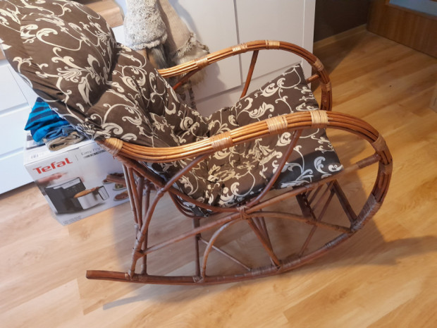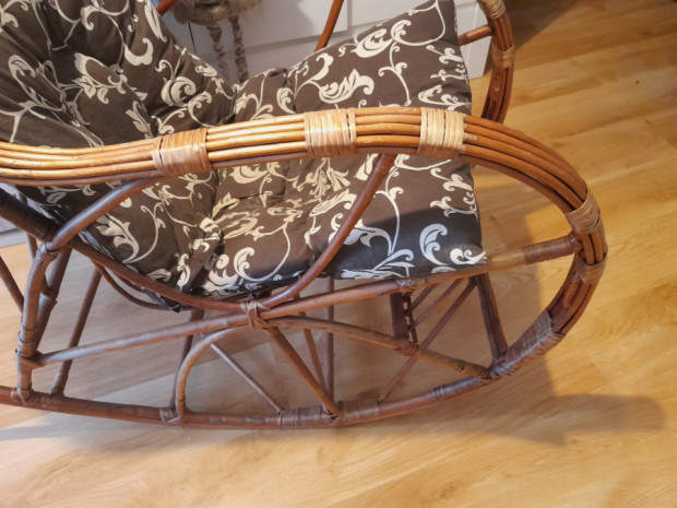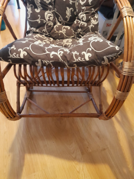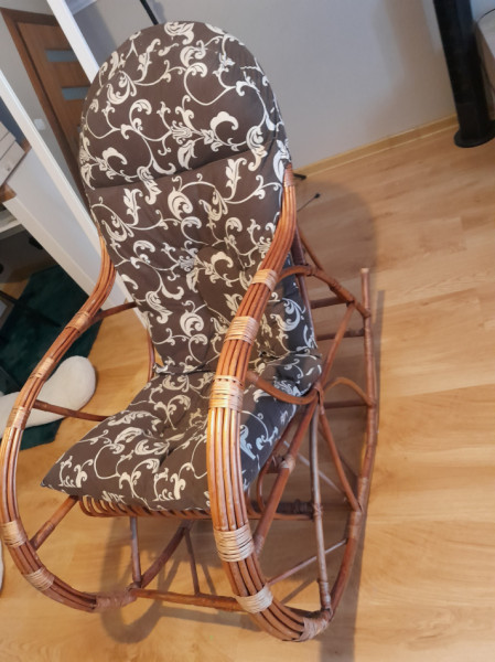 Fotel wiklinowy bujany z poduszką w kolorze brązowym w bdb stanie,praktycznie stoi nieużywany od nowości.