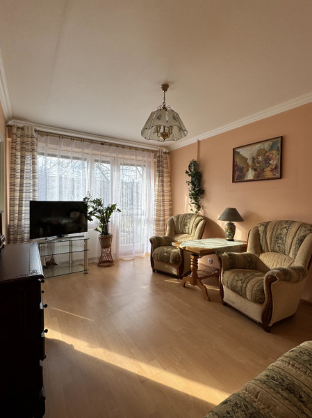 Jasny i przestronny, wyposażony w telewizor, fotele, rozkładaną sofę z funkcją spania oraz komodę.