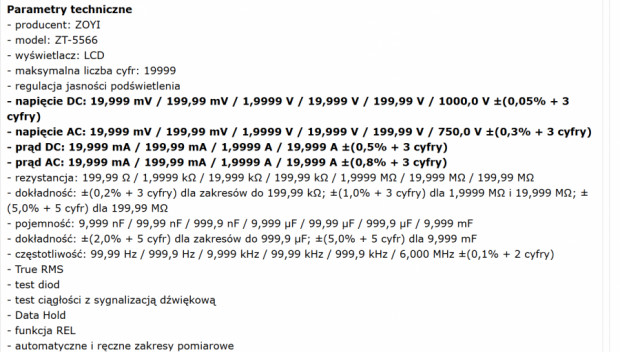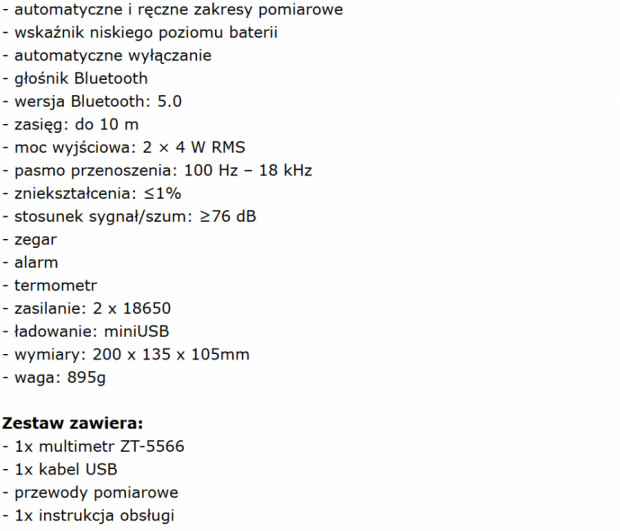 Sprzedam doskonały, poręczny multimetr Zoyi ZT-5566SE. Jest to najbogatsza wersja w tej serii multimetrów. Jest jak nowy, popracował w sumie może ze 3 godziny. Zasilany dwoma ogniwami 18650. Posiada bargraf, termometr, zegar itp. Funkcja BlueTooth umożliwia obserwowanie wskazań multimetru na telefonie komórkowym bedąc np. w sąsiednim pomieszczeniu, jak również słuchanie muzyki na 2 głośnikach wbudowanych w multimetr. Bardzo ciekawa jest również funkcja głosowego podawania aktualnych wskazań multimetru - wystarczy wcisnąć przycisk na ujemnej sondzie pomiarowej. Parametry i zakresy pomiarowe widoczne na zdjęciach. Multimetr jest dokładny, porównywałem jego wskazania z dobrej klasy multimetrem UNI-T UT71C, były niemal identyczne. Więcej informacji udzielę telefonicznie. Zapraszam do kontaktu 797 024 171. Cena 300zł.