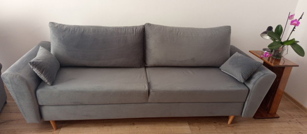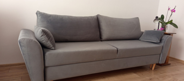Wygodna, trzyosobowa sofa w bardzo dobrym stanie z funkcją spania. Wykonana z wysokiej jakości materiału w kolorze szarym. Posiada wygodne, miękkie poduszki oraz solidną konstrukcję. Idealna do salonu lub sypialni.