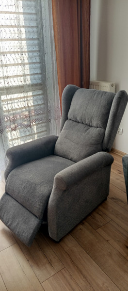 Wygodny fotel wypoczynkowy w kolorze popielatym. Posiada regulowane oparcie, dzięki czemu można dopasować jego ustawienie do własnych potrzeb. Fotel jest w bardzo dobrym stanie. Miękkie, głębokie siedzisko i wysokie oparcie możliwość rozłożenia. Tapicerka z tkaniny, wygodny i łatwy w utrzymaniu czystości, idealny do salonu.