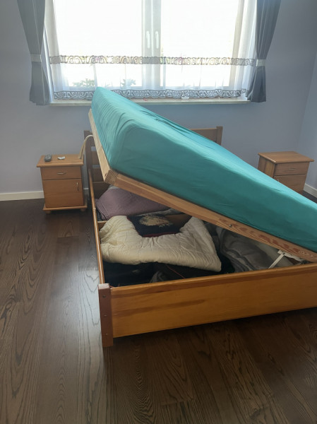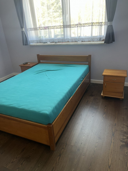 łóżko drewniane z materacem, dwie szafki