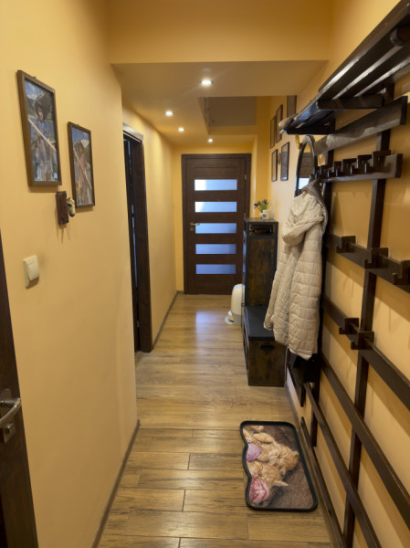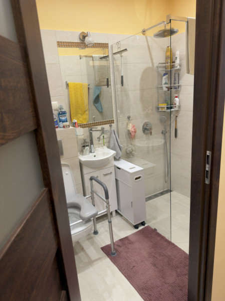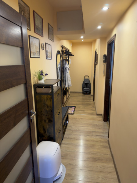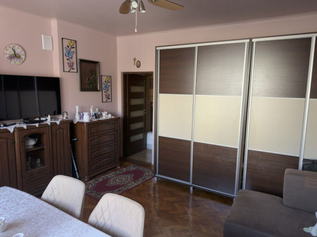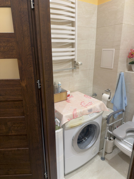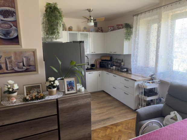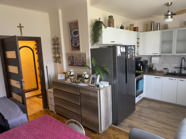 Układ mieszkania został częściowo zmodyfikowany – mniejszy pokój został połączony z kuchnią, tworząc funkcjonalną, otwartą przestrzeń dzienną. Dodatkowo w mieszkaniu znajduje się duża, ustawna sypialnia oraz łazienka z WC.