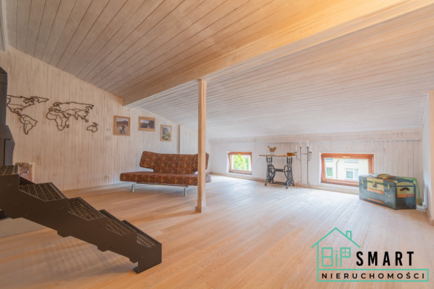 Jasne, wykończone naturalną drewnianą lamperią poddasze to prawdziwa perła tego domu. To może być Twój domowy gabinet, pracownia artystyczna, sala zabaw dla dzieci, strefa fitness, biblioteka czy cokolwiek, czego potrzebuje Twój styl życia. Wysokie skośne sufity i naturalne drewno tworzą wyjątkowy, skandynawski klimat.