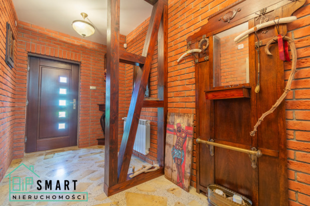 Wchodząc do domu, od razu czujesz jego wyjątkowy charakter. Korytarz wykończony dekoracyjną czerwoną cegłą w industrialnym stylu, eleganckimi drewnianymi elementami architektonicznymi (rzeźbione lustro, stylowa szafka z dekoracjami) oraz marmurową posadzką tworzą pierwsze wrażenie – to dom z klasą i charakterem.