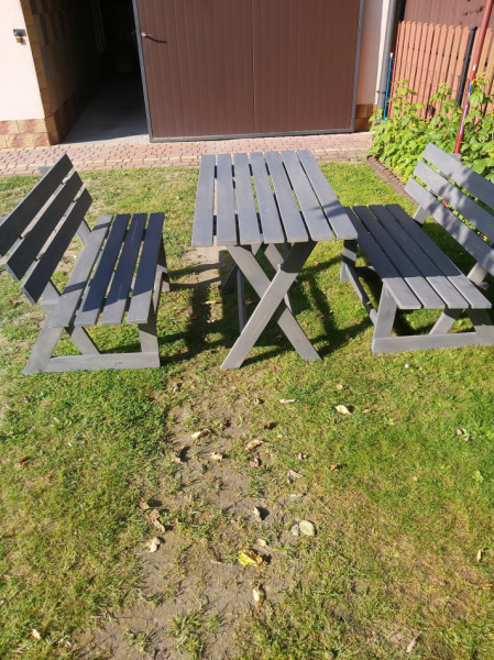 Zestaw ogrodowy tarasowy nowy modrzewiowy stolik 120x72x73 I 2 ławki 120x45x80 kolor szary antracyt malowane dwa razy mat możliwy transport do 10 km w cenie ławka 190x40x80 sosnowa kolor cedr za 250 zł