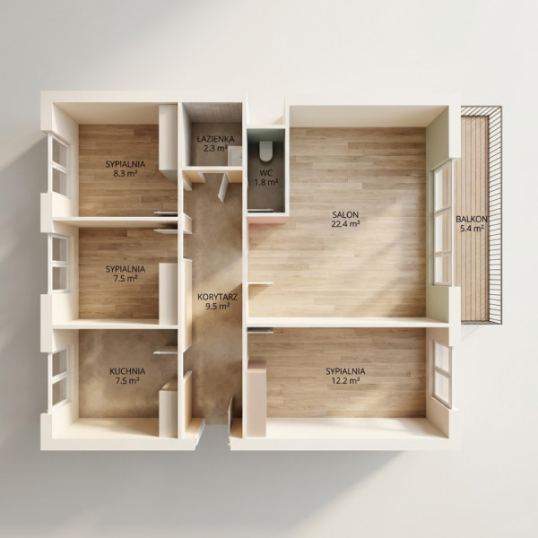 - 4 niezależne pokoje – brak przechodnich pomieszczeń