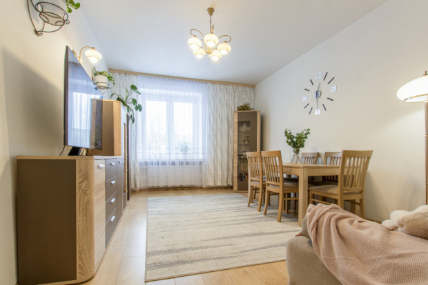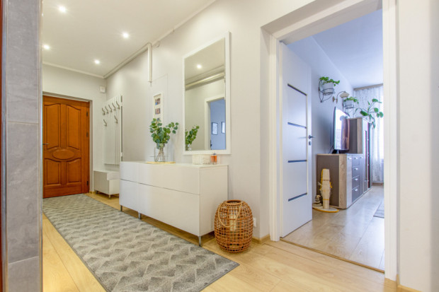 Mieszkanie składa się z przestronnego salonu, sypialni, dodatkowego pokoju (idealnego na pokój dziecięcy, gabinet lub garderobę), oddzielnej kuchni, łazienki z oddzielnym WC oraz korytarza. Lokal jest dwustronny, z oknami wychodzącymi na północ i południe, co zapewnia dobre doświetlenie wnętrz przez cały dzień oraz możliwość naturalnej wentylacji. Układ jest funkcjonalny i zapewnia wygodę zarówno dla pary, jak i rodziny z dzieckiem.