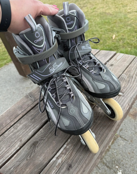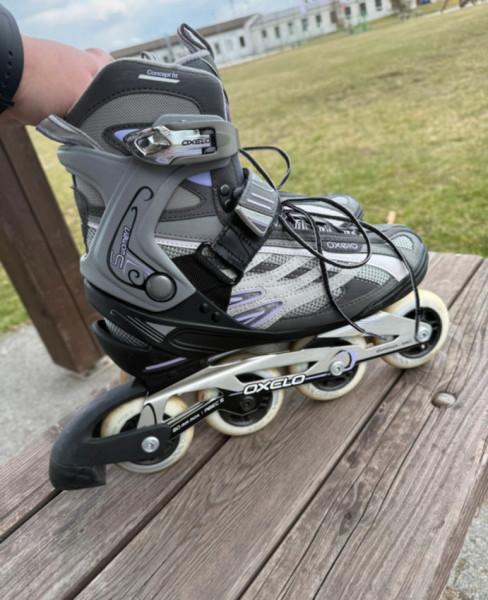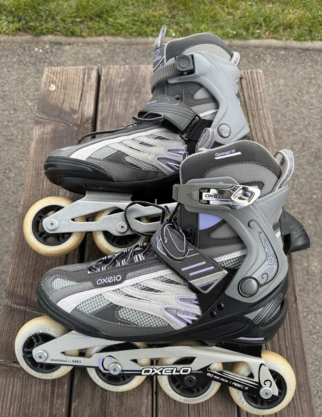 Sprzedam rolki Oxelo w bardzo dobrym stanie Rozmiar z metki 41 jednak po zmierzeniu wkladki wewnatrz buta mają 25,5cm wiec raczej jest to rozmiar 40