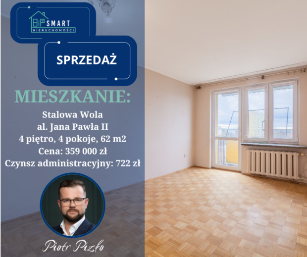 Biuro BIP Smart Nieruchomości przedstawia ofertę sprzedaży dużego 4-pokojowego mieszkania o powierzchni 62 m², położonego na 4. piętrze w dogodnej lokalizacji przy al. Jana Pawła II w Stalowej Woli.