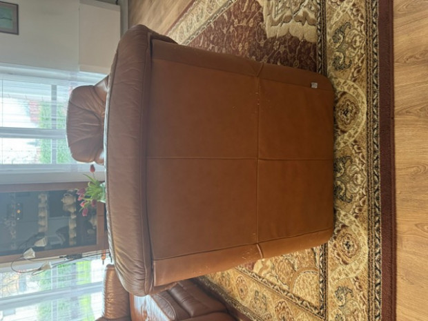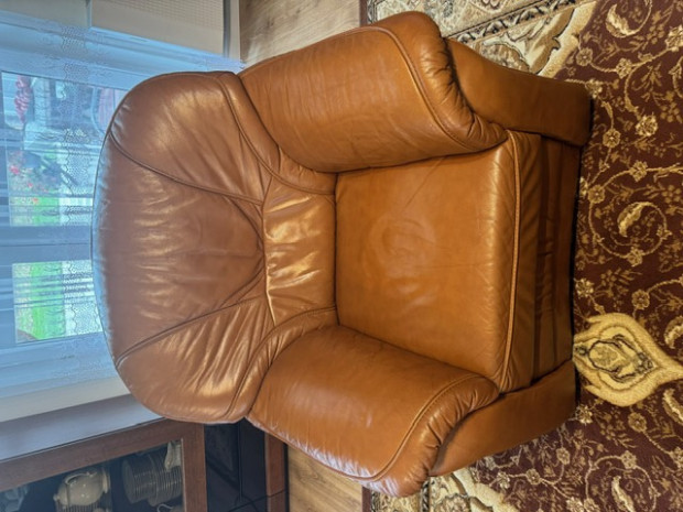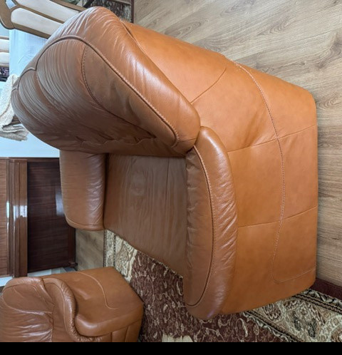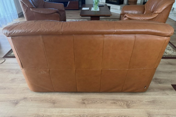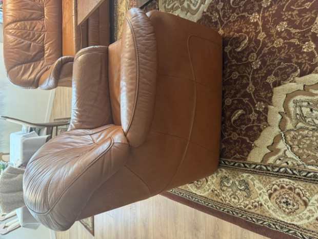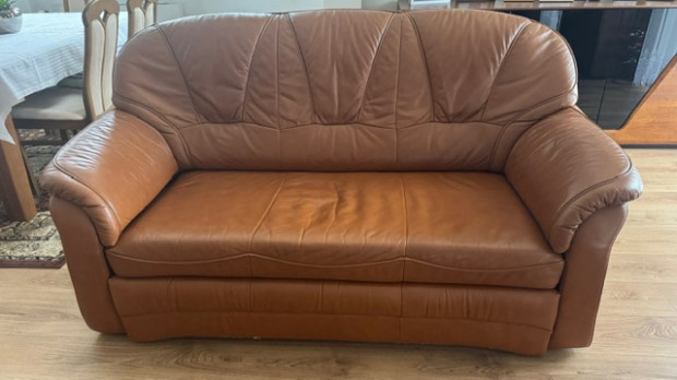 Sprzedam zestaw wypoczynkowy: kanapa i fotel ze skóry brązowej. Kanapa rozkładana - z funkcją spania. Stan bardzo dobry, meble bardzo wygodne, solidnie wykonane. Wymiary: kanapa - szer. 185 cm, wys.95 cm, fotel- szer. 100 cm, wys. 95 cm, wys. podłokietnika 64 cm.