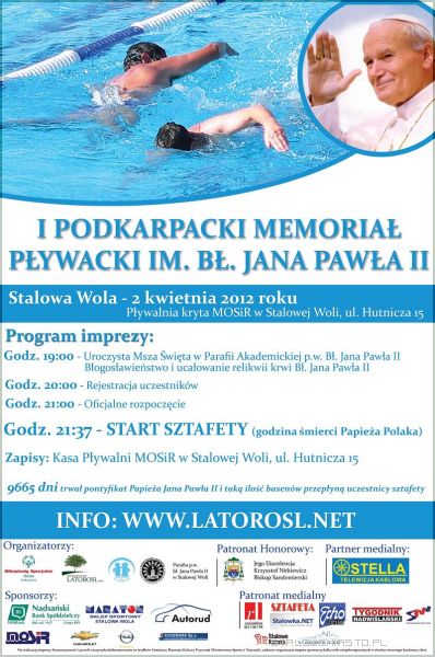 2 kwietnia 2012 roku organizatorzy oraz uczestnicy „I Podkarpackiego Memoriału Pływackiego im. bł. Jana Pawła II” na pływalni krytej Miejskiego Ośrodka Sportu i Rekreacji w Stalowej Woli w sposób szczególny uczczą 7. rocznicę śmierci Papieża Polaka.W tym dniu odbędzie się niezwykła sztafeta, która złożona z ochotników przepłynie łącznie 9665 długości basenu – dokładnie tyle, ile dni trwał pontyfikat Jana Pawła II.