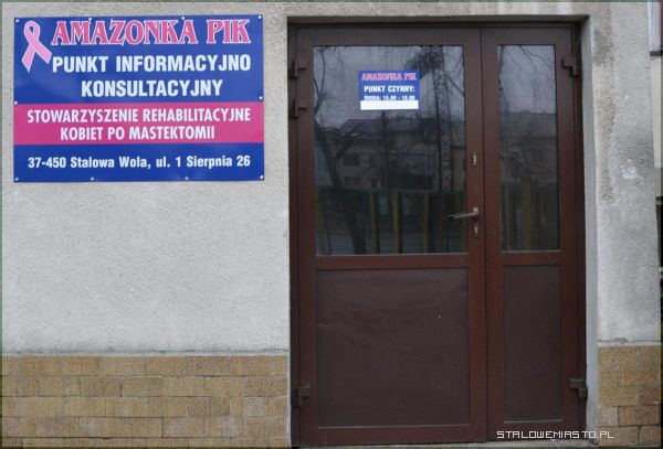 Kontakt z AmazonkamiAmazonki w budynku ZSP nr 2 im. T. Kościuszki w Stalowej Woli otrzymały od starostwa pomieszczenie gdzie mieści się teraz punkt informacyjno- konsultacyjny Stowarzyszenia Rehabilitacyjnego Kobiet po Mastektomii Amazonka Pik. Punkt służy pomocą psychologiczną i nauką rehabilitacji kobietom leczonym z powodu nowotworu piersi oraz ich rodzinom w chwili kryzysu emocjonalnego, związanego z zagrożeniem życia. W punkcie tym, odpowiednio przeszkoleni specjaliści: psycholog i rehabilitant, w zależności od potrzeb, pełnią dyżury i udzielają porad każdej potrzebującej tego osobie, dotkniętej problemem onkologicznym.