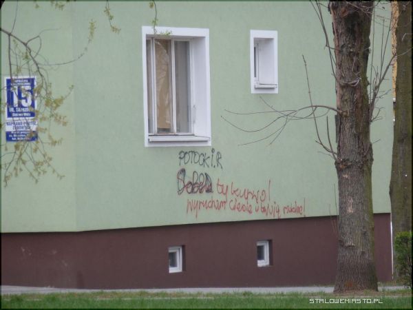 Budynek na którym pojawił się napis mieści się przy ul. Popiełuszki 5, jest to blok na wprost kościoła, zaraz przy skrzyżowaniu. Hasło pojawiło się od wewnętrznej strony osiedla. Jeśli wzrok skierujemy nieco dalej, to zobaczymy, że na budynku przy Staszica 15 również są wymazane napisy, które szpecą blok. Do tego są wulgarne i budzą niesmak przechodniów.