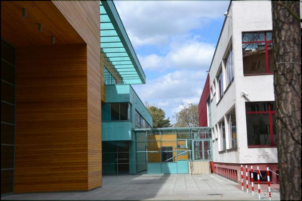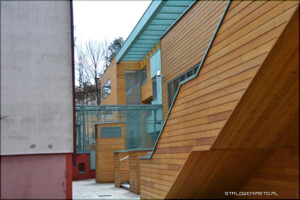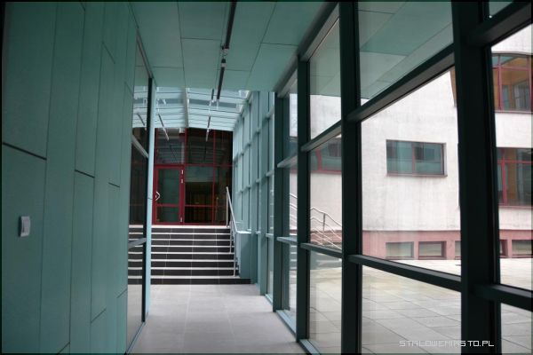 Obiekt jest monitorowany zarówno na zewnątrz, jak i wewnątrz. Połączony został korytarzem z drugim budynkiem mieszczącym się tuż obok. Na zewnątrz, na parterze jest taras, z którego biegną na piętro schody. Tam także znajduje się drugi taras z widokiem na park, ogródek jordanowski i pozostałe budynki. Tuż obok wybudowano duży parking.