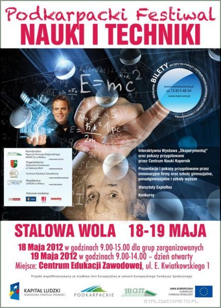 Agencja Rozwoju Regionalnego „MARR” S.A., jako koordynator zadania wraz z koordynatorem lokalnym Starostwem Powiatowym oraz Centrum Edukacji Zawodowej w Stalowej Woli ma zaszczyt zaprosić uczniów, nauczycieli, dyrektorów placówek oświatowych oraz w szczególności mieszkańców powiatu stalowowolskiego do udziału w Podkarpackim Festiwalu Nauki i Techniki w Stalowej Woli w dniach 18-19 maja 2012r.
