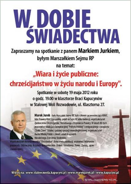 W dobie świadectwa! Były Marszałek Sejmu RP Marek Jurek w sobotę odwiedzi Stalową Wolę. Na spotkanie na temat: "Wiara i życie publiczne: chrześcijaństwo w życiu narodu i Europy" zapraszamy w sobotę 19 maja 2012 roku na godz. 19.00 do klasztoru Braci Kapucynów w Stalowej Woli Rozwadów, ul. Klasztorna 27.