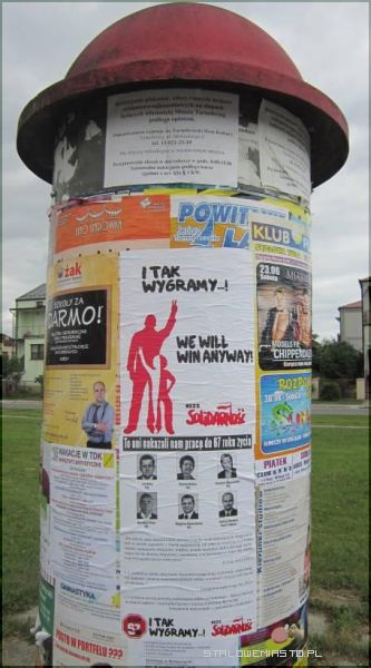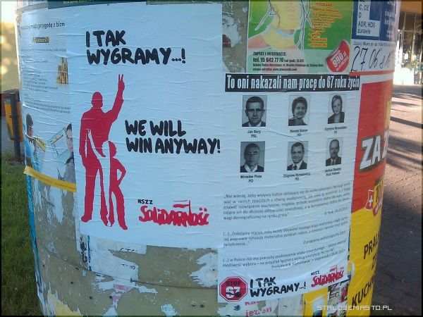 I tak wygramy! – głosi hasło na jednym z plakatów, które NSZZ Solidarność rozkleiła w mieście. Na innym czytamy: „To oni nakazali nam pracę do 67 roku żucia” i widzimy zdjęcia posłów z Platformy Obywatelskiej Polskiego Stronnictwa Ludowego i Ruchu Palikota.