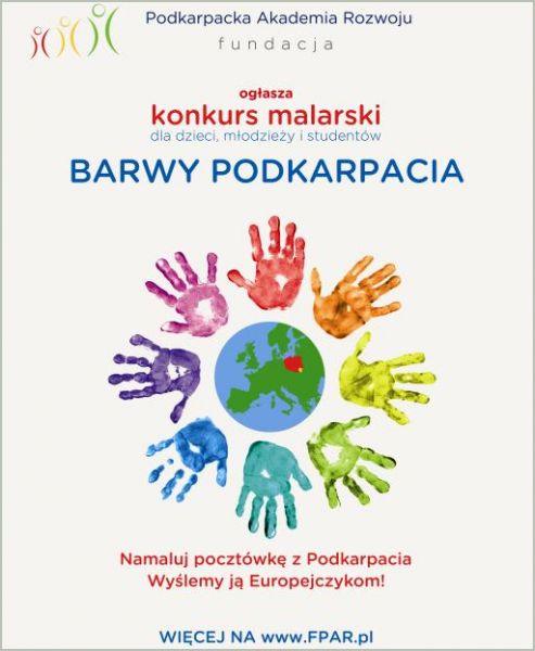 Fundacja Podkarpacka Akademia Rozwoju ogłasza konkurs malarski pod hasłem "Barwy Podkarpacia”. Mogą w nim wziąć udział dzieci i młodzież ucząca się w szkołach podstawowych, gimnazjach, szkołach średnich oraz na uczelniach wyższych województwa podkarpackiego. Tematem konkursu malarskiego jest przedstawienie regionu Podkarpacia jako malowniczego zakątka pełnego wspaniałych krajobrazów, architektury, nieskazitelnej przyrody i kulturowej wielobarwności, zaprezentowanie jego historii i tradycji we wszystkich kolorach pór roku. Konkurs malarski pozwoli wyłonić młodych ambasadorów kultury oraz zaprezentować ich twórczość mieszkańcom regionu, a także prezydentom wszystkich krajów Unii Europejskiej.