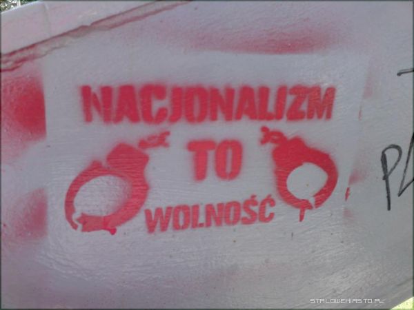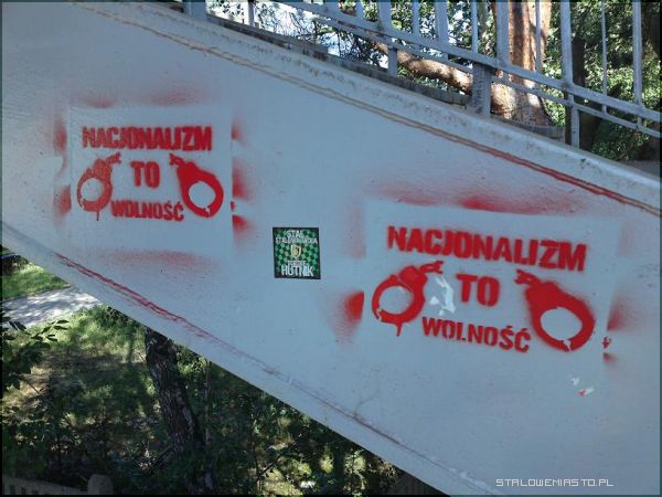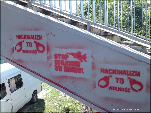 Nacjonaliści dodali swoje 3 groszePrzez najbliższe miesiące mieszkańcy będą jednak nadal korzystać z odnowionej kładki, bo innego wyjścia nie ma gdy się chce przejść z jednej części miasta do drugiej. Po niemal roku od remontu jej wygląd stanowczo się pogorszył, w wielu miejscach pojawiła się rdza i zacieki. Dodatkowo przysłowiowy gwóźdź do trumny dołożyli wandale niszcząc boczne płaszczyzny tuż przy zejściach ze schodów. Sprayami zapisane poglądy nie przysłużyły się do estetyki tego obiektu. Teraz przechodzień może przeczytać następujące hasła: „NACJONALIZM TO WOLNOŚĆ”, „STOP WOJNOM ZA IZRAEL”, „DEMOKRACJA DO URN”.